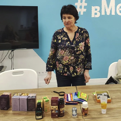 На другом мероприятии Елена Даданова подробно рассмотрела программу профилактики старения. Начали с упражнений для стоп: это полезно для позвоночника, ведь позвоночник — каркас всего тела человека. Затем перешли к разбору специальных биостикеров, которые оказывают оздоровительный трансдермальный эффект через стопы. После переключились на вопросы по предупреждению деменции с использованием не только фитосредств, но и специальных упражнений для когнитивных функций мозга: вместе пели песни, учили стихи и рассказывали их друг другу. В завершении все участники, в том числе сама Елена, дали обещание, что будут учить по одному новому стихотворению к каждому следующему мастер-классу.